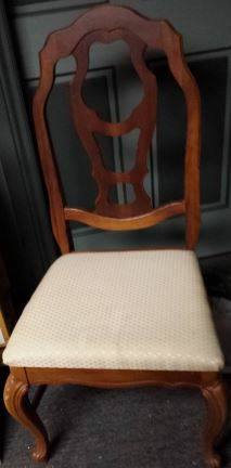 The table (not shown) and chair set was an early Craigslist score. When I went to pick them up it turned out it was from the estate of the mother of a local well known artist, who lived in a very grand mansion. He gave me a tour ( I ❤️old homes!) and I was in awe!. I paid $100 for the entire French Provincial dining set. This was my first ever time using chalk paint and I took the chair to a class as my "project". I had already purchased the (NOT thrifted fabric) beforehand and stapled over the existing. It turned out so well the "teacher" staged them and used the photo (right) on her website to promote the class. This was done in Annie Sloan Old White, which is expensive. Since than I've learned ways to make my own chalk paint. While the high end fabric made this a not so friendly to the budget project, the fact that I scored the set for cheap, made the fabric splurge obtainable.