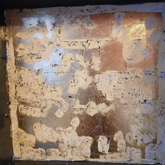 DURING: The gold leaf process. Apply glue, let get tacky, CAREFULLY apply gold sheets. The last picture you can see where I applied the glue as sealer before applying it to the entire piece.